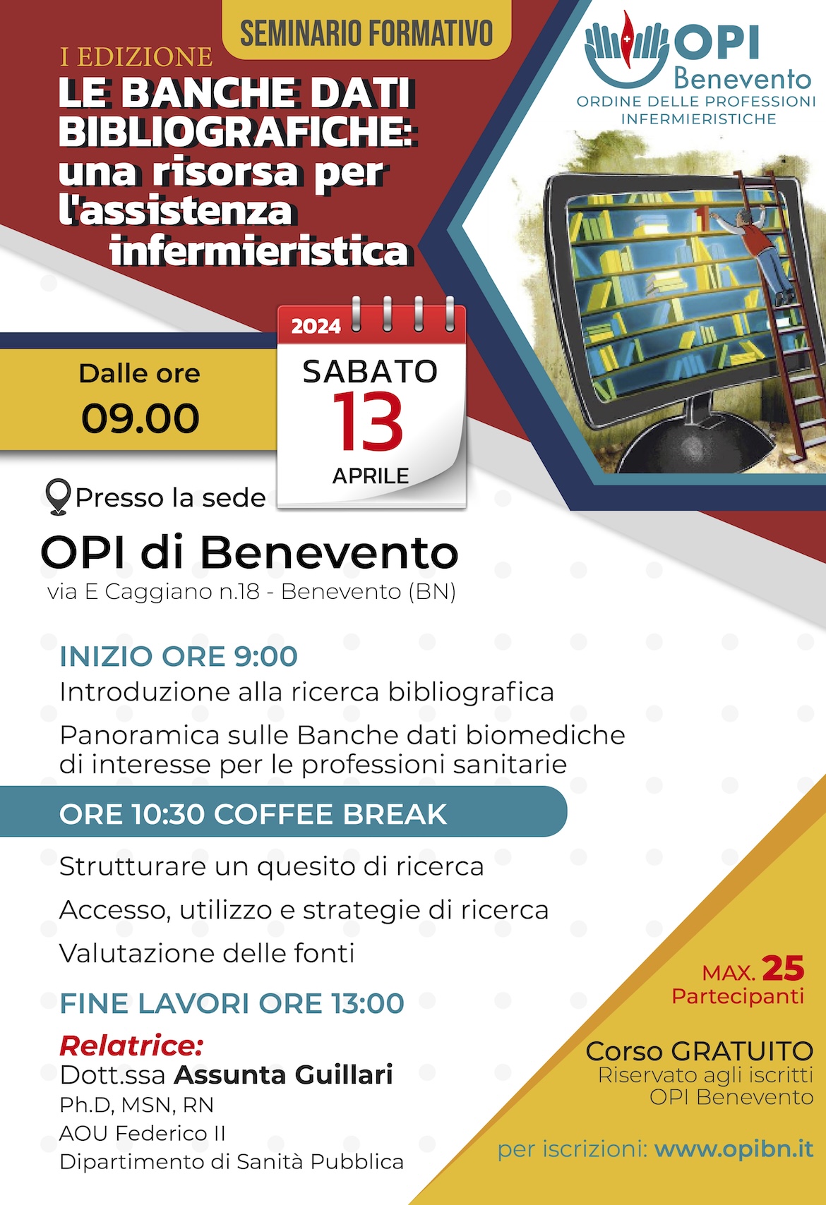 Il corso si terrà a Benevento presso la sede dell’OPI Benevento in via E. Caggiano, 18 il 13 Aprile 2024 dalle h9.00 alle h13.00